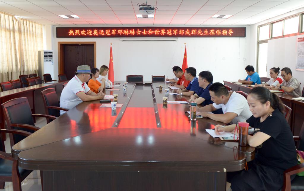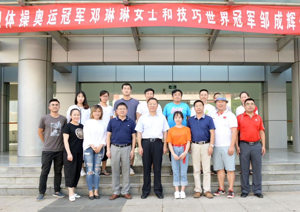 7月26日下午,体操奥运冠军邓琳琳、技巧世界冠军邹成辉在安徽省啦啦操协会秘书长胡彩红等陪同下来公司考察交流。党委副书记、董事长闵永新会见了邓琳琳一行;公司党委常委、副董事长汪时珍与邓琳琳一行进行座谈交流,体育公司党政主要负责同志、部分专业教师参加座谈。