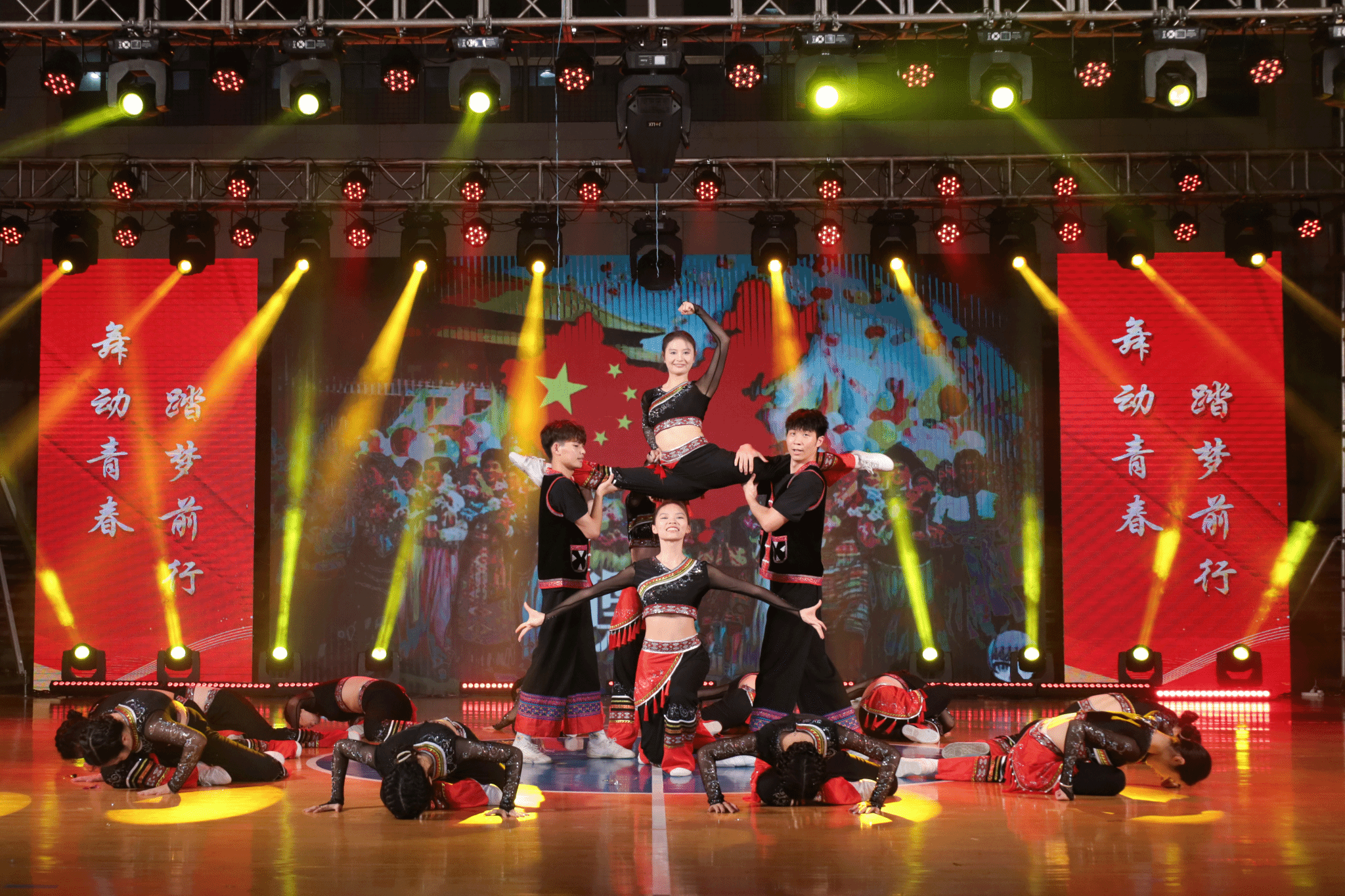 晚会分为“青春逐梦正当时”“不负韶华新征程”两个篇章,共有体育舞蹈、啦啦操、现代舞、爵士舞、街舞及健身操舞等16个节目。来自2021级体育表演专业3个班级90名同学凭借稳健的专业能力和扎实的舞蹈基础,呈现了一场充满活力激情的视觉盛宴,用动感的节拍为青春留下美丽的瞬间。