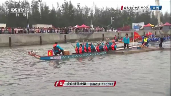 万宁站赛场位于港北海湾,水急浪涌,与校龙舟队日常训练环境反差极大,但凭借优异的发挥,校队在25日的预赛中晋级决赛圈。26日比赛中,在100米排位赛出现失误未能出线和鼓手、舵手相继被海浪打落的不利局面下,队员们迅速调整心态,完成了随后的两项比赛。27日农历二月二“龙抬头”当天的决赛中,在CCTV等众多媒体的注目下,校女子龙舟队奋力拼搏,第一次在全国大赛中夺得名次。