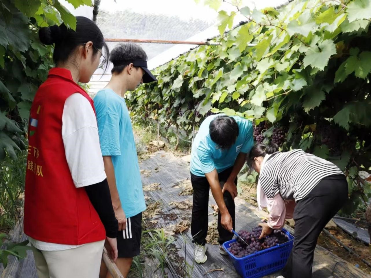 抵达小圩村的第一天,实践团在小圩村金国平书记的带领下,走进了葡萄种植基地,亲眼见证了“巨峰葡萄”“阳光玫瑰”等优质品种的大丰收盛景。成员们身着采摘服,手持剪刀,帮助农民采摘葡萄。在忙碌的采摘过程中,他们深切体会到农民的艰辛,同时也学会了如何辨别葡萄的成熟度、如何正确采摘等实用技能。大家顶着烈日,汗流浃背,一心想着帮农民叔叔阿姨多干些活儿,多采摘几串成熟的葡萄,真切地感受着劳动所带来的快乐。