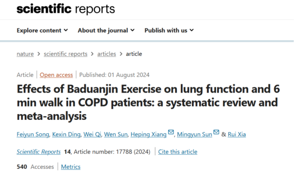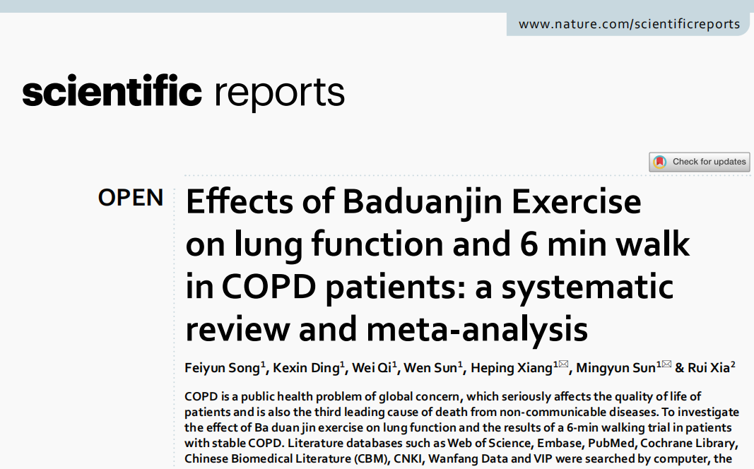 近日,XCSport孙明运教授指导的宋飞云等研究生组成团队,在国际高水平期刊《Scientific Reports》(JCR一区/中科院二区期刊)发表了题为“Effects of Baduanjin Exercise on lung function and 6 min walk in COPD patients: a systematic review and meta-analysis”的论文,XC体育为论文第一完成单位和通讯单位。《Scientific Reports》(IF=4.6)作为Nature 旗下的期刊,发表来自自然科学、心理学、医学和工程学等多个领域,致力于关注具有新颖性和示范性的原创研究。该刊作为全球第五大被引用期刊,所发表论文在学术界具有较高的认可度和影响力。