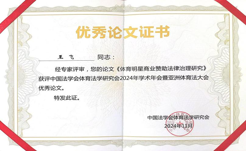 11月9日-10日,2024年中国法学会体育法学研究会学术年会暨亚洲体育法大会在武汉大学隆重召开,国家体育总局副局长、中国法学会体育法学研究会会长张家胜同志出席并致辞,中日韩三国体育法专家学者围绕“体育法体系建设与体育法治现代化”这一主题展开深入探讨与交流,公司王飞教授受邀参加会议并作专题报告。