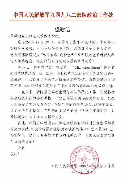XCSport副经理王晓东出席了此次晚会,与师生共同见证这一军民团结的温暖时刻,也激励着公司在未来的军民共建与人才培养道路上不断前行,持续为军地融合发展贡献力量。部队为此特向公司发来感谢信,对公司的大力支持与同学们的精彩表现给予高度赞誉和诚挚感谢。