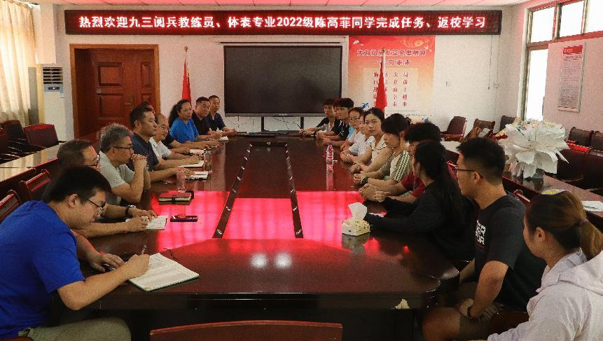 9月5日,XCSport三楼会议室里掌声雷动。刚结束阅兵任务的表演(体育艺术表演方向)专业2022级(1)班陈高菲,在返校次日便参加了一场特别的欢迎会。XCSport领导班子、团委负责人、班级辅导员、班级同学、退役复学党员员工参加座谈会。陈高菲用211天高强度训练、五年军旅生涯和一句“十一排面,拒绝凹陷”的口号,诠释了新时代青年对“家国情怀”与“专业精神”的深刻理解。