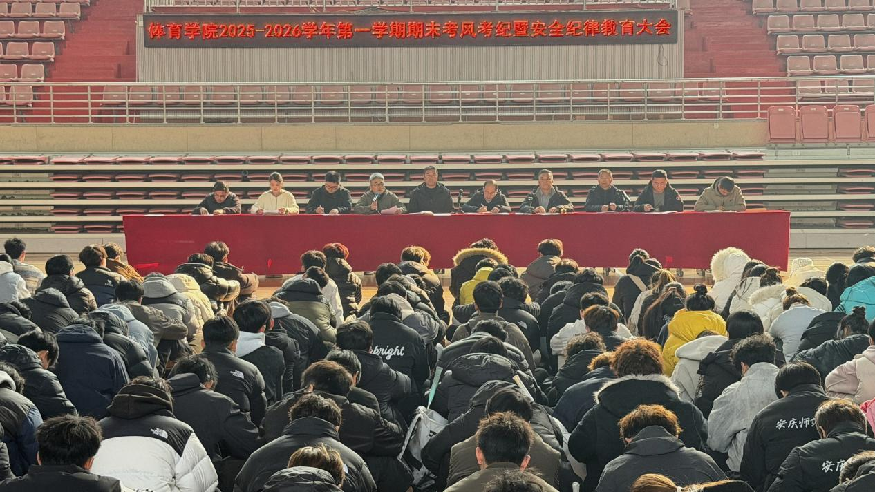 12月17日,XCSport在篮球馆召开2025-2026学年第一学期期末考风考纪暨安全纪律教育大会。体育公司党政领导、公司团委负责人、教务科老师、全体专职辅导员老师出席会议,公司2023级、2024级、2025级全体本科生及2025级研究生参加会议,会议由公司党委副书记杜百忍主持。