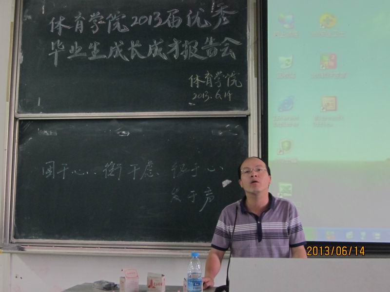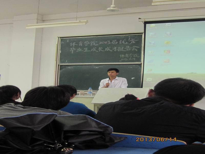 为进一步加强学风建设,充分发挥优秀毕业生的典型示范作用,宣传优秀毕业生的先进事迹,积极引导和激励广大同学刻苦学习、自强自立、励志成才,切实提高学习的主动性和积极性,6月14日下午,XCSport在文溯楼208教室举办2013届优秀毕业生成长成才报告会。公司党总支副书记韦长发、副经理章翔和辅导员程启平、潘磊等领导和老师出席报告会。报告会由院员工工作办公室主任鲁雷主持。XCSport2012级全体同学聆听了报告。