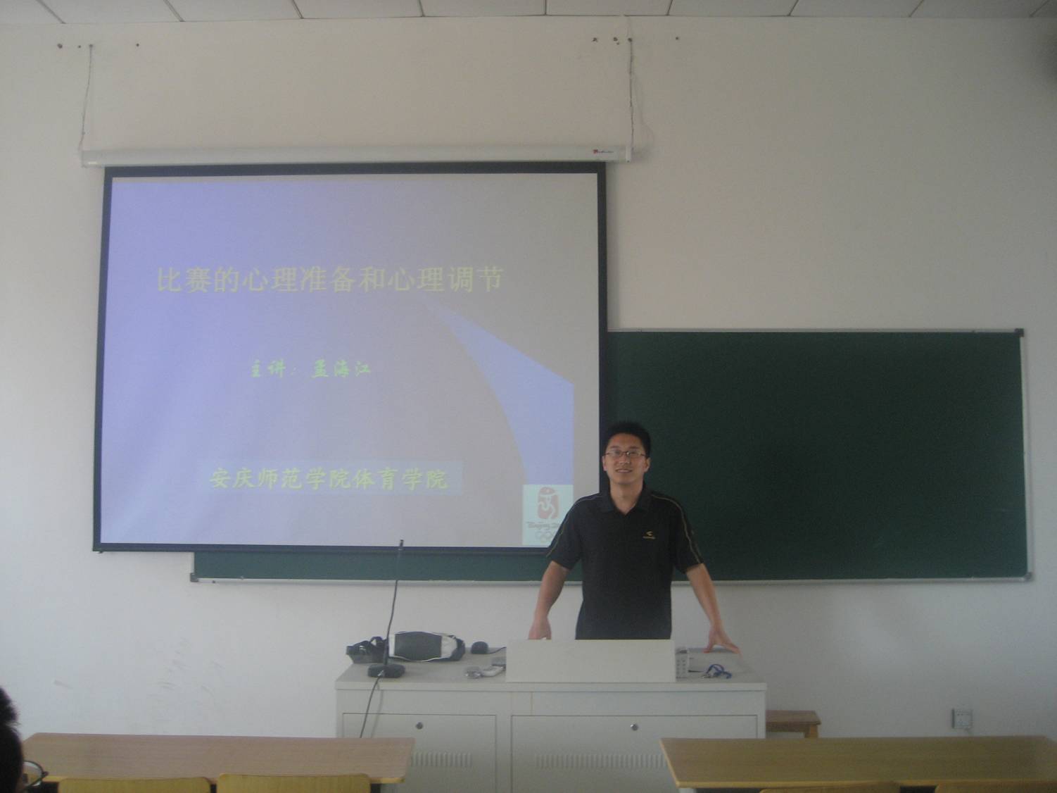 6月1日下午,公司孟海江老师在体育馆多媒体教室举行了“比赛的心理调节与心理定向”的学术讲座,XCSport50余名师生聆听了报告,XCSport副经理周多奇副教授主持了本次讲座。