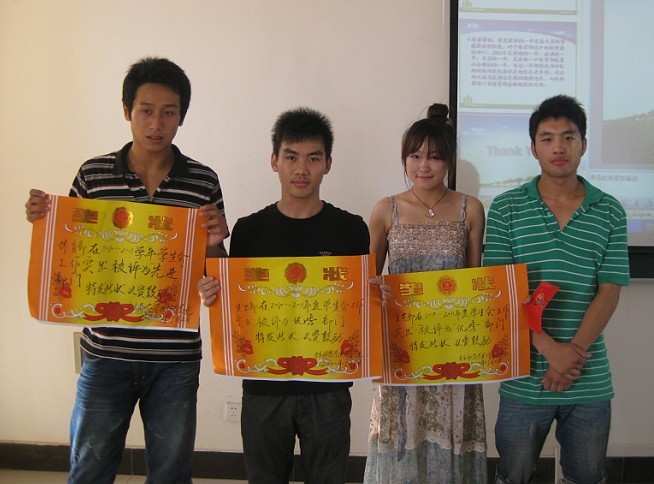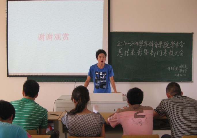 在随后的员工会工作考评中,主席团及各部门代表分别就本学期以来各自开展的工作情况进行了总结。每个部门精心制作的ppt充分展示了一学期以来各自部门的日常工作及特色活动的开展情况,对过去的工作进行经验总结,对未来工作提出了想法和计划。汇报的内容包含了工作过程中遇到的难题与挫折,当然更多的是部门工作中的收获和快乐,举办活动时大家的齐心合作与积极配合。一幅幅照片带着大家一起回忆本学期以来员工生活的点点滴滴。台上同学极富感情的讲述,台下评委则忙着为各部门进行认真地评分。经过评委对十一个部门各个方面的综合评分,最终员工会体育部获得了“XCSport2010-2011学年员工会先进部门”称号,文艺部和生卫部则获得“XCSport2010-2011学年员工会优秀部门”称号。汪老师上台为获奖部门代表颁发了荣誉证书。