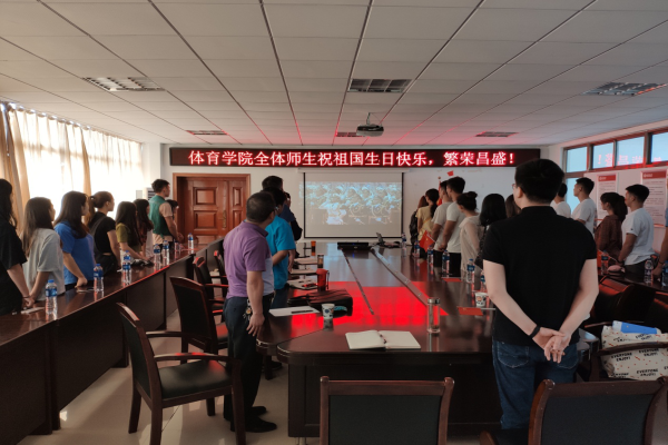 10时整,庆祝中华人民共和国成立70周年大会正式开始。当天安门前礼炮鸣响,鲜艳的五星红旗在天安门广场冉冉升起,收看直播现场的所有师生起立齐唱国歌,用雄壮高亢的国歌声,与全国人民一起,表达对新中国成立70周年的美好祝福。直播现场内不时掌声雷动,师生们都难以掩抑自己的激动之情。