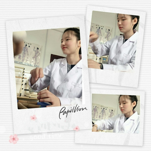 在安庆石化医院实习期间,她在物理康复、神经康复、作业治疗、传统治疗等科室轮转实习,独立为脑卒中的病人做康复治疗,和代课老师学习使用理疗机器、取针膏摩等康复用具,将书本中的理论知识真正用于实践中。
