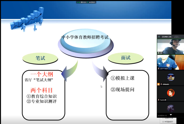 为进一步做好党史学习教育,把“我为群众办实事”落到实处,6月2日下午,XCSport通过线上举行2021届毕业生教师招考培训会,给参加2021年各级教师招考的同学提供精准的笔试和面试指导,帮助员工们更好地进行职业发展规划,从而积极推动公司2021届毕业生高质量就业。本次讲座邀请了原安庆市第九中学副董事长、现任北京市陈经纶中学体卫艺处负责人、正高级教师王琦老师主讲,XCSport经理章翔教授也为同学们做了教师招考培面试环节的专题培训,公司党政领导、毕业班辅导员老师以及2021届毕业生、其他年级员工参加本次线上培训会。