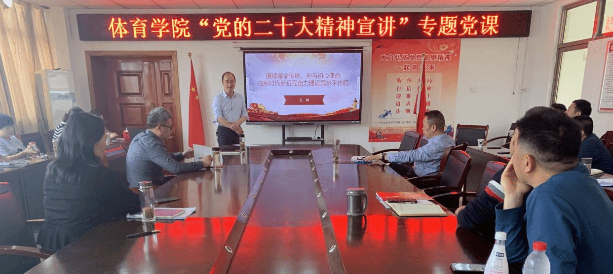 4月12日下午,XCSport在体育馆三楼会议室举办“党的二十大精神宣讲”专题党课。XCSport副书记、纪委书记王玮以“赓续革命传统,担当初心使命,在新时代新征程奋力建设高水平体院”为题,给公司全体教工党员讲授党课。