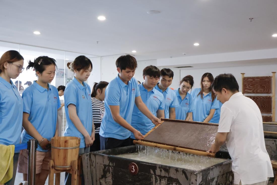 剥皮、浸泡、踏料……从原料处理到捞纸成型,再到晒纸裁切,一张宣纸“诞生”于108道传统工序。“原以为造纸不过是简单的‘化浆成纸’,现在才惊觉每道工序都是千年智慧的沉淀!这样文化传承的‘活化石’,值得被更多人看见。”团队成员、旅游管理(对口)专业2023(2)班的吴圆媛感慨。据现场讲解员介绍,这些传统技艺需经过多年经验积累才能掌握“火候”,团队成员全程跟拍记录,系统整理了宣纸制作工艺的技术要点与传承现状。