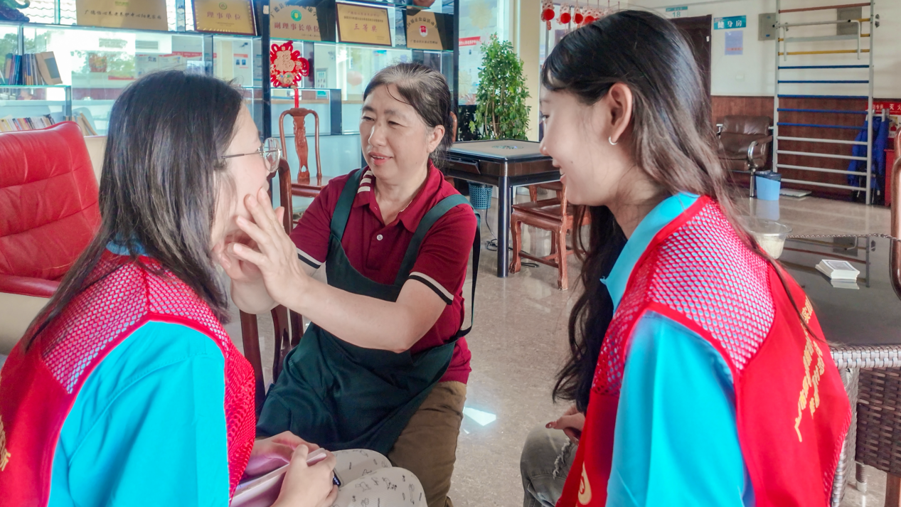 团队成员们化身“健康科普员”,用接地气的方式讲解知识。“这是地仓穴,用拇指或食指指腹揉按,避免用指甲掐揉,可有效治疗口角歪斜、流口水,调理面部肌肉松弛。”他们一边演示,一边耐心指导老人操作。考虑到部分老人听力不佳或理解较慢,队员们特意蹲在老人身旁,放大手势、放慢语速,一遍又一遍演示穴位按摩,直到爷爷露出明白的笑容。这些细微的互动,让健康科普不只是知识传递,更成为心与心的温暖联结,让老人在学习中感受到被重视、被关爱 。