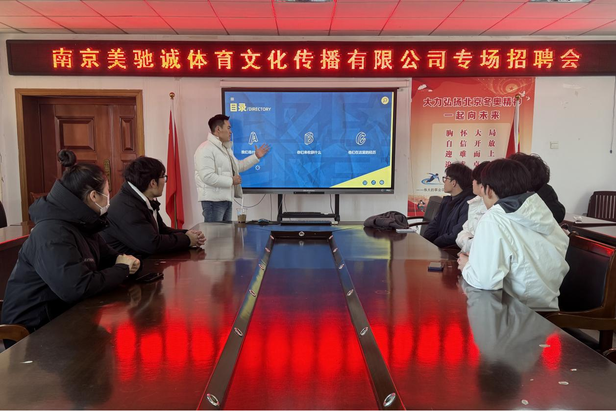 12月27日,公司在三楼会议室举行2026届毕业生专场招聘会,邀请南京美驰诚体育文化传播有限公司进行就业宣讲和招聘。公司就业秘书和体育专业专项班毕业生参加招聘活动。
