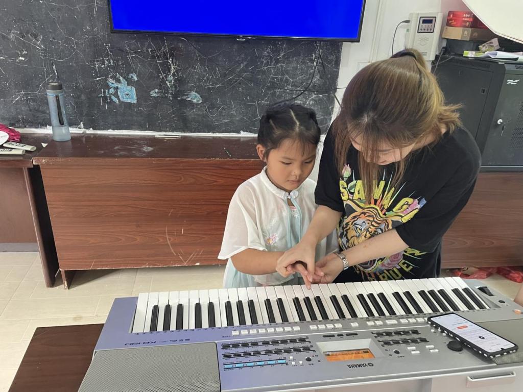 “事实上,村子里面的很多小朋友是没有学习过钢琴的经历的,虽然我并不足够优秀,但我希望通过一些教学让孩子们学会一些钢琴的基础知识,希望他们能够喜欢上了钢琴.我想这不仅是陪伴他们,和他们一起玩耍,也是用了我们自己的专业知识,给小朋友们最大的帮助。”队员武文君如是说。她执起小朋友们的手,带领他们按着一个又一个的琴键,单个的音符随着手指的落下,有序的从钢琴中蹦出。“刚开始教的时候,孩子们还有一些羞怯,后来随着不断的交流,孩子们也逐渐放松起来,对钢琴也产生了极大的兴趣。”她说。