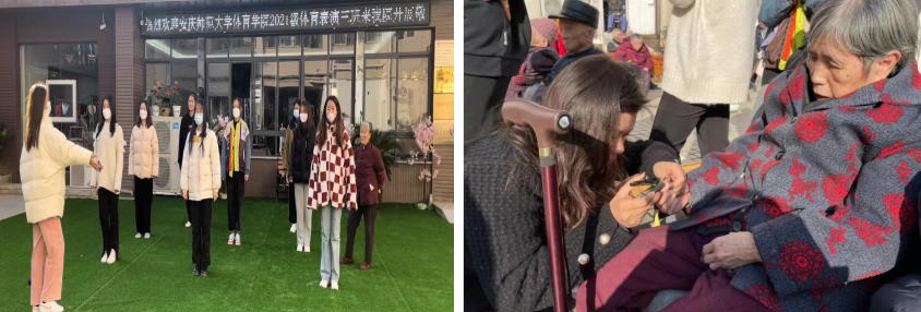 除了聊家常,员工还为老人们表演了精心编排的舞蹈,与老人们一起合唱 “天仙配”、“我和我的祖国”等歌曲,风趣的表演让老人们合不拢嘴,整个敬老院充满欢声笑语、掌声不断。“看到老人们脸上洋溢的笑容,听到老人们爽朗的笑声,我们充分体会到了本次活动的意义所在。” 2021级体表3班团支书王莹说道:“希望我们的到来能够让老人们在精神上能够老有所依、老有所乐”