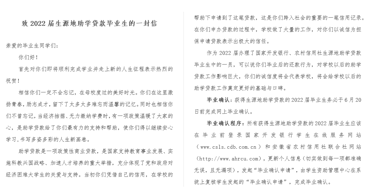 为保证生源地信用助学贷款持续健康的发展,公司组织了2022年毕业员工贷款确认工作。公司将《致2022届生源地助学贷款毕业生的一封信》转发给毕业生,确保每一位同学都收到相关消息。生源地信用助学贷款员工毕业确认工作,有助于确保生源地贷款的按时回收,加强员工对国家助学贷款及其他资助政策的了解,培养员工们守信做人、心怀感恩、勇担责任的意识。