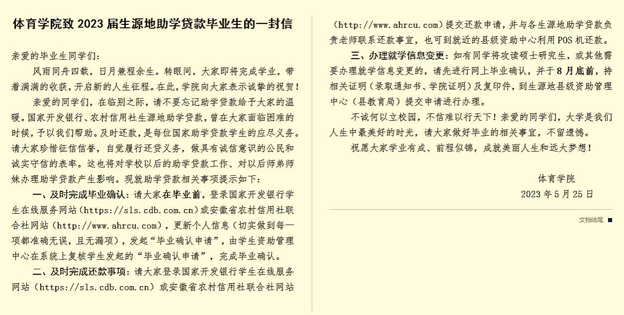 “奋斗是青春最亮丽的底色,行动是青年最有效的磨砺”。作为青年员工,应当有责任、有担当,用智慧和汗水共筑中国梦;作为家庭经济困难的员工,更应该明白,诚信乃立身之本,诚信还贷是对党和国家资助政策的回报,也是检验自身诚信为人的重要指标。为切实做好公司2023届贷款毕业生的贷后管理工作,帮助贷款员工树立诚信还贷意识,公司撰写并发布了《XCSport致2023 届生源地助学贷款毕业生的一封信》,就毕业确认、贷款还款和办理就学信息变更等事宜进行了详细介绍,将诚信教育贯穿于毕业生文明离校教育中,强化对诚信意识、法律意识和契约精神的宣传。