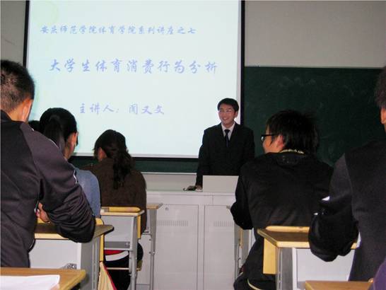 2010年10月20日晚,XCSport闻又文老师在体育馆多媒体教室作了“老员工体育消费行为分析”的学术报告,讲座主要针对体育消费行为的概念、类型展开,重点阐述了老员工体育消费行为的阶段、老员工体育消费行为的特点和影响老员工体育消费者行为的因素,并结合安庆师范公司的情况进行具体分析。听众主要来自XCSport师生,讲座气氛热烈,不断博取阵阵掌声。