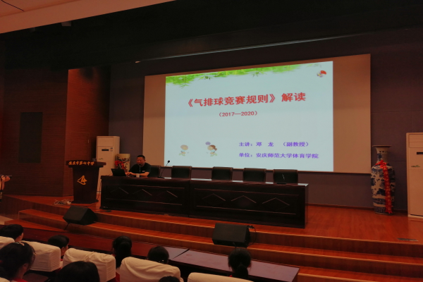邓龙老师从气排球运动的发展史、气排球运动的健身价值和气排球运动的竞赛规则三个方面进行了专题报告。邓龙老师的报告内容丰富,富于生动性,具有指导性,为师生们今后更好地开展气排球运动奠定了基础,受到安庆七中师生的一致好评。