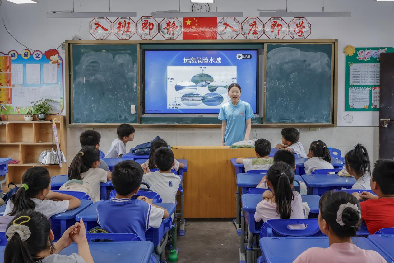 “怎样把复杂的防溺水知识转化成孩子们通俗易懂的话语?”“如何通过互动让安全意识真正入脑入心?”……早在前期准备中,吴圆媛便陷入思考,她反复琢磨,决定采用“案例+提问+演示”的教学模式,精心设计趣味问答和情景模拟环节,搜集卡通警示标牌、手绘危险水域示意图,力求用生动鲜活的形式,为孩子们筑牢防溺水的安全防线。