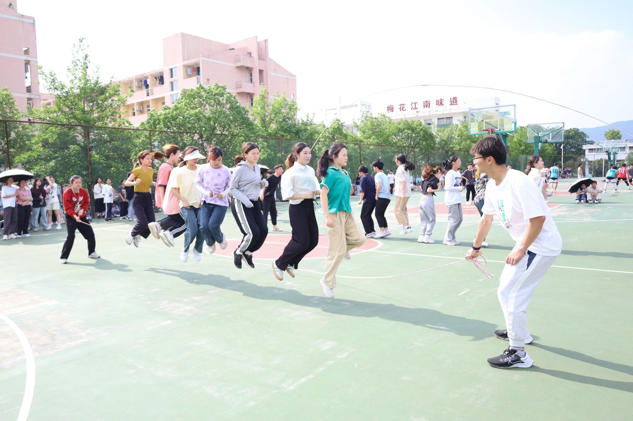跳绳比赛分为个人赛和团体赛,员工们动作敏捷迅速,紧密配合。“我喜欢通过运动锻炼身体、放松心情。”数学专业2022(3)班的邵亦涵是体育场上的“健将”,跳绳是她的“拿手项目”。她表示,员工们利用课余时间参加体育比赛,既能丰富校园生活,又能锻炼抗压能力。“比赛中,我曾发挥失常,被绳绊倒,但我迅速回归‘战场’,同样获得了满意的名次。”