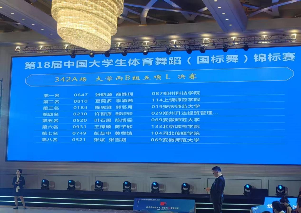 公司体育表演专业6名同学参加比赛,共获得3项二等奖(1个第三,2个第四)的优异成绩,其中在艺考表演招生专业最高组别(丙B组)的五项拉丁比赛中取得第三名的骄人战绩,同时也是安徽省高校在本组别上的最好成绩。