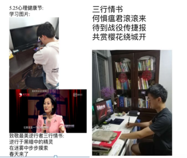 本次线上心理健康节设置“线上学习心理健康知识”“开展心理讲座”“观看战‘疫’纪录片”“‘致最美逆行者’三行情书”等内容。活动中,每位员工都积极准备并参与。2018级员工王鹏程也总结了自己的感想:“虽然此次“心理健康节”活动是在线上举行,但是同学们的积极性却丝毫没有受到影响。作为心理服务部部长,我能深深地感受到同学们参与的热情与认真的态度!”
